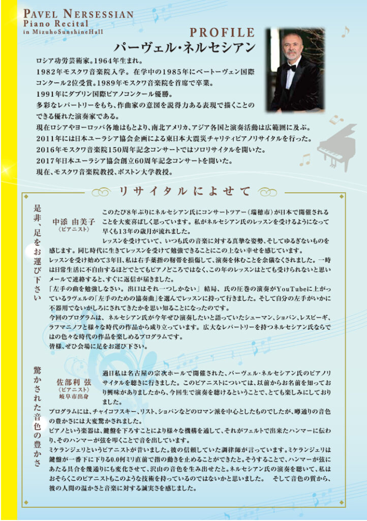 2025年11月22日(土)瑞穂コンサートのお知らせ 2025年10月13日 最終更新日時 : 2025年10月13日 wpmaster 令和7(2025)年11月22日(土)、2年ぶりに『第8回 ほたる光の森チャリティーコンサート』を開催します。本年は主催者である特定非営利活動法人 岐阜福祉事業支援友の会の設立10周年に当たり、感謝の意を込めての開催となります。 それぞれお知合いの皆様方からのご案内があるかと思います。長く続いた猛暑の夏も一段落し、本格的な芸術の秋を迎える時期。世界的なピアニストの演奏を是非、お楽しみ願います。 FacebookXCopy